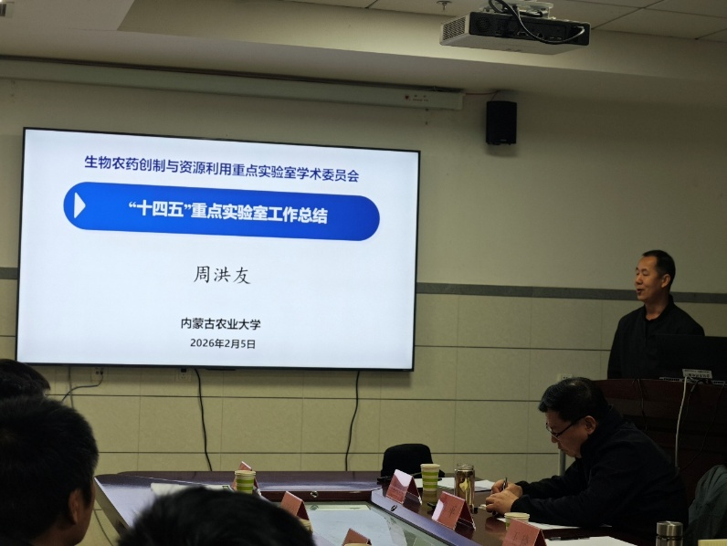2026年2月5日,生物农药创制与资源利用自治区高等学校重点实验室2025年度学术委员会年会在内蒙古农业大学顺利召开。会议由园艺与植物保护学院副院长杨忠仁主持。开幕式上,学校科技处副处长蒙仲举出席会议并讲话,介绍了自治区在高等学校重点实验室建设中的整体规划与布局要求,为实验室未来建设指明了政策方向。随后,实验室主任周洪友教授作年度工作报告,围绕“十四五”期间重点工作部署,系统汇报了实验室在科研攻关、核心成果产出、创新突破、学术交流与行业影响力、人才培养等方面的情况,并介绍了“十五五”期间的发展规划与攻坚方向。